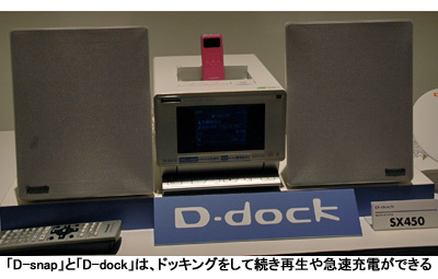 一方、「D-dock」は、HDD容量が160GBの「SC-SX850」と80GBの「SC-SX450」の2機種を発表。「SC-SX850」には最大8万曲、「SC-SX450」には最大約3万9000曲が収録可能で、PCレスでCDからHDDに最大12倍速、HDDからSD最大16倍速で楽曲を転送できる。
