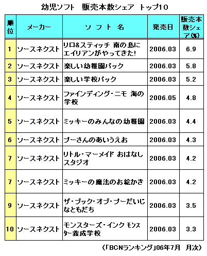 では、現在の人気ソフトを「BCNランキング」で見てみよう。1位はソースネクストの「リロ&スティッチ 南の島にエイリアンがやってきた!」で販売本数シェアは6.9%。対象年齢は5歳以上。