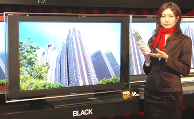 ソニーは8月30日、液晶テレビ「BRAVIA(ブラビア)」の新製品9機種を発表した。年末商戦に向け、全モデルで色の再現力を強化し、40V型以上の大型タイプを7機種投入する。06年末には金額ベースで40V型以上の販売構成比率を50%まで高める計画で、「06年度第1四半期での世界シェア16%以上」(井原勝美・代表執行役副社長テレビ・ビデオ事業本部事業本部長)を狙う。