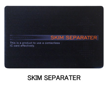 2枚の非接触ICカードの間に挟み、カードリーダー(読み取り機)にかざした側の非接触ICカードを読み取れるようにする製品。カードホルダーや定期入れなどに、「スキム セパレーター」を挟んでカードを3枚重ねでセットすれば、ケースに入れたまま、表裏を返すだけで2種類の非接触ICカードを利用できる。