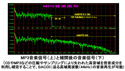 具体的には、高域周波数の補間・スムージング処理などを行うことによって、周波数とダイナミックレンジを44kHz/120dBまで拡大し、原音の信号波形に近い音をシミュレートする。響き・臨場感・雰囲気などが加わった「より自然な心地良い音」が再現できる。また、ユーザー個人の可聴範囲に合わせた聴覚感度補正など独自技術により、それぞれのユーザーに合った音質で再生することも可能。