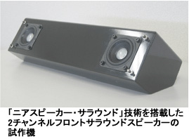 開発したのは、「ニアスピーカー・サラウンド」と呼ばれる技術。すべてのマルチチャンネル信号に独自の処理を行い、利用者の耳元でマルチチャンネルサラウンド音場と同じになる「バイノーラル信号」に変換。左右の耳に入る、バイノーラル信号以外の余分な音声を取り除くと同時に独自の信号処理を加えることで、1つのスピーカーでサラウンド音声が再現できるようにした。