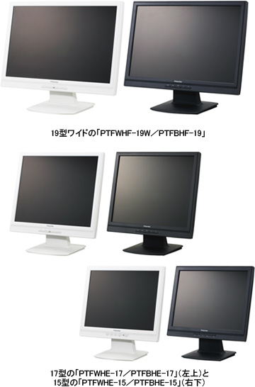 15型「PTFWHE-15」「PTFBHE-15」は、応答速度は8ms。最大輝度は250cd/m2、コントラスト比は700:1、視野角は水平方向が150度、垂直方向が135度。モニタ下面にステレオスピ?カー(1W×2)を内蔵し、D-subミニ15ピンを装備。液晶ディプレイは現在17型以上が一般的だが、公共機関など一部で1024×768ドッドの画面表示に適した15型に対する需要があるため、製品化したという。