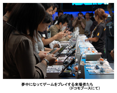 今年の「東京ゲームショウ」は特別協賛のNTTドコモに加え、KDDI、ボーダフォン(ソフトバンク)の2社が加わり、家庭用ゲーム機用ソフトだけではなく、モバイルコンテンツに力が入っている。各キャリアとも多数の端末をブースに用意し、夢中になってゲームに興じる人の姿も見かけた。