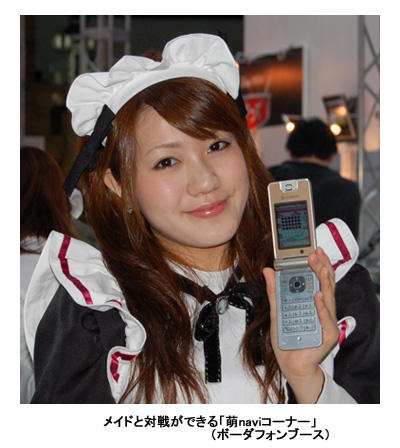 来月からソフトバンクに社名変更するボーダフォンでは、来月配信予定のアドベンチャーゲーム「萌navi」の告知ブースとして、メイドたちとBluetooth対応ミニゲームが楽しめる「萌naviコーナー」を設けた。メイドたちとミニゲームの対戦ができるほか、ゲームの遊び方も教えてもらえるとあって、多くの来場者が立ち寄っていた。