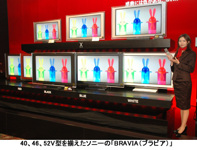 「液晶テレビの大型化トレンドを牽引する」――8月末、液晶テレビ「BRAVIA(ブラビア)」の年末商戦モデル発表会で、ソニーの井原勝美副社長はこう宣言した。ソニーが新ブランド「BRAVIA」を投入したのは昨年の10月。その当初から40V、46V型モデルもラインアップし、大型液晶テレビ市場を開拓してきたという自負からの言葉だ。