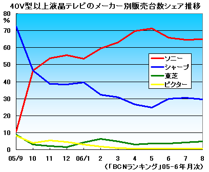 40V型以上の液晶テレビ市場でメーカー別の販売台数シェアを見てみると、ソニーがトップ。ソニーは「BRAVIA」で発売当初から40V型クラスを商品の中核に据える戦略を打ち出しており、この狙いが見事に当たった。去年10月に第1弾の発売後、それまでトップだったシャープとシェアが逆転。以降、急速にシェアを伸ばし、一時は70%を超えた。その後も常に50%以上のシェアを安定して獲得している。