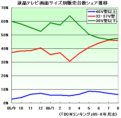 一方、液晶テレビ市場で中心となっている「32・37V型」は3月以降、シェアを30%から40%台に急速に伸ばした。トリノ五輪が終わり、6月のサッカーワールドカップ(W杯)に向けた商戦が3月頃から立ち上がり、主力モデルとして販売されたことがシェア増加を後押ししたと見られる。W杯以降も40%台と高い水準をキープしているが、この背景には、期待したほど盛り上がらなかったW杯の影響で在庫がダブつき価格が下落。結果として販売台数では堅調だったのではないかと考えられる。