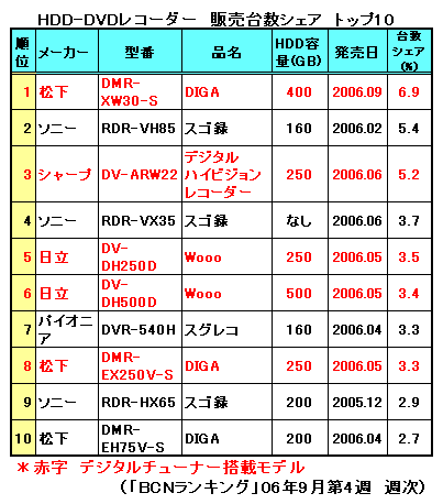 9月第4週(9月18日-9月24日)の「BCNランキング」では、400GBのHDDを搭載した松下電器産業のHDD-DVDレコーダー「DMR-XW30-S」が販売台数シェア6.9%で1位を獲得した。9月1日に発売したばかりのDIGAの新モデルで、06年9月第2週(9月4日-9月10日)に初めて1位を獲得して以来、3週間連続で首位を維持している。