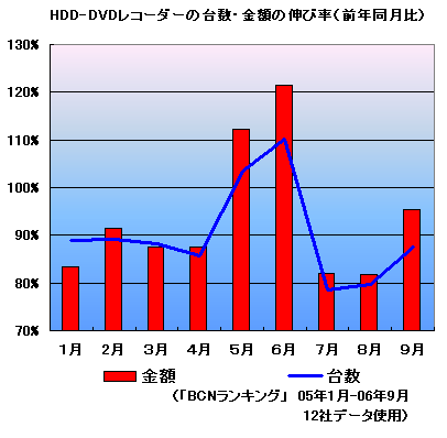 HDD-DVDレコーダー市場は、サッカー・ワールドカップの「特需」効果があった5月と6月だけは前年を上回る売り上げを記録したものの、それ以外の月は販売台数・金額ともに前年同月比2ケタ減の水準で推移している。しかし、販売台数で前年同月比78.5%に終わった7月をボトムに、9月は台数ベースで9ポイントアップの87.5%、金額ベースでも13.3ポイントアップの95.3%にまで回復してきた。ここにきて少し潮目が変わってきたようだ。