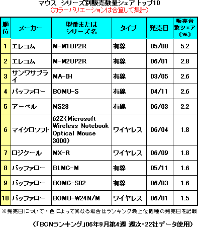 デザインや色、大きさ、機能などの違いで、多種多様な製品が出回るマウス。最も売れている製品でも販売数量シェアは1桁台と激戦区だ。「BCNランキング」06年9月第4週(06年9月18日-9月24日)で、カラーバリエーションを合算した値では、エレコムの「M-M1UP2R」が5.2%で1位を獲得した。2位も同じくエレコムの「M-M2UP2R」で2.8%。これらはサイズ違いの兄弟マウスで、「M-M1UP2R」は小型のノートPC向け、「M-M2UP2R」はデスクトップPC向けの大型サイズ。どちらも、USBとPS/2に対応する光学式のごく一般的な有線マウスだ。続く3位はサンワサプライの「MA-IH」、4位はバッファローの「BOMU-S」だった。