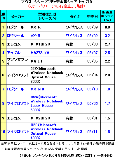 それが7位のロジクール「MX-R」だ。9月15日に発売されたばかりの多機能ワイヤレスレーザーマウスで、発売とともに上位に登場。発売第1週目の9月第3週には、シェア2.4%で5位、翌週の9月第4週も7位につけた。