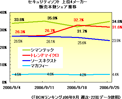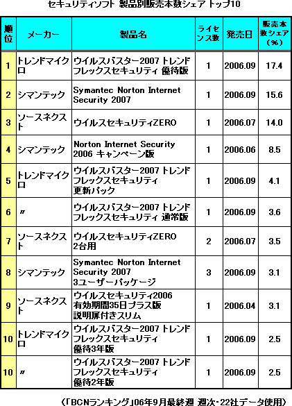 トレンドマイクロが9月22日に発売した「ウイルスバスター2007 トレンド フレックス セキュリティ」は、9月最終週(06年9月25日-10月1日)のBCNランキングで販売本数シェア1位を獲得した。6月から16週連続で1位だった「ノートン」シリーズにとって代わった背景には、新バージョン発売のタイミングがある。9月最終週は、22日発売の「ウイルスバスター2007」の立ち上がり時期。一方、シマンテックの「Symantec Norton Internet Security 2007(ノートン 2007)」などは9月30日発売で集計対象は土日の2日間のみ。この発売日のズレが、わずか1.8ポイントの僅差での逆転劇につながったようだ。