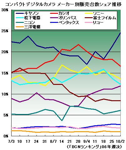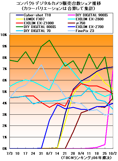 メーカー別ではどうだろう。10月第1週に3機種がトップ10入りしたキヤノンがシェア24.5%で1位を獲得。「900IS」の勢いもあり、20%台半ばまで急速にシェアを上げてきた。2位は16.6%でカシオ。キヤノンと同じく3機種がトップ10入りを果たしたが、シェアは下降気味でキヤノンに大きく離されている。今後は「Z-700」の売り上げにかかっている。