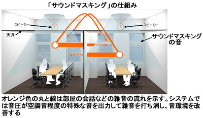 一定の大きさの音が聞こえている状況下では、耳の感度が下がり、より小さな音が聞こえなくなるという人間の耳の特性「マスキング効果」を利用。空調音に似た背景音をオフィス内に均一に分散させることで、関係のない会話や騒音を聞こえにくくする。類似のシステムは米国で広く普及しているという。