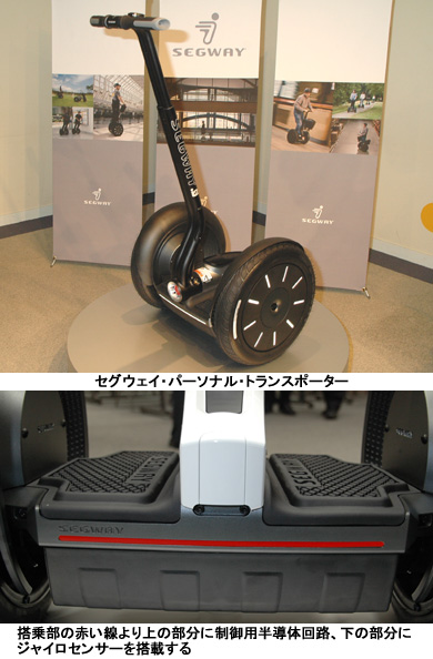 「セグウェイPT」はジャイロセンサーと制御用半導体を使った自律制御機能を搭載。アクセルやブレーキを使わず、使用者が立ったまま体重移動することで発進や停止、左・右折ができるのが特徴。従来機は操作にハンドルを使っていたが、新型機ではすべて操作を体重の移動のみで行う。最高速度は時速20km。電源には家庭で充電できるリチウムイオンバッテリーを使用する。6-12時間の充電で8-10時間の稼動が可能。
