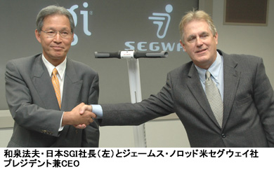 一方、和泉法夫・日本SGI社長はセグウェイの販売に乗り出した理由について、「『セグウェイ』は半導体などITの先端技術が詰め込まれており、当社の手がける事業との融合が見込める」と説明。セグウェイ単独の販売だけでなく、セグウェイとコンピュータと組み合わせた物流管理システムなどのソリューションを開発・販売していくことも明らかにした。また、00年から始めたロボット事業でセグウェイ社との技術的な提携も行っていく。