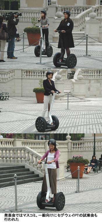 また、発表会ではマスコミや一般の人を対象にした試乗会も開催され、40人ほどが「セグウェイPT」の乗り心地やスピードなどを楽しんだ。