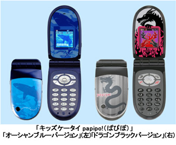 バンダイは11月1日、ウィルコムのPHSモジュール「W-SIM(ウィルコムシム)」を搭載した子供向けPHS端末「キッズケータイ papipo!(ぱぴぽ)」の男の子バージョン「オーシャンブルーバージョン」「ドラゴンブラックバージョン」を11月23日に発売すると発表した。バンダイの専用オンラインサイト、ウィルコムの販売代理店、トイザらスで販売する。価格はオープン。実勢価格は9800円前後の見込み。