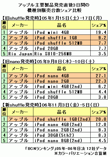 新shuffle発売直後のこの動きは度の程度のインパクトなのか? 他の同社製品の発売直後3日間の動きと比べてみた。まず、第1世代のiPod shuffle(旧shuffle)が発売された05年1月15日から3日間(土曜日-月曜日)では、当時売れ筋だったiPod miniの4GBモデルが19.4%で1位。2位が旧shuffleの1GBモデルで9.2%、3位が同512MBモデルで7.7%だった。1GBモデルと512MBモデルを合わせても、旧shuffleは16.9%と2位のポジションに留まっていた。