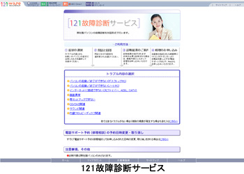 「121故障診断サービス」は、ユーザーがパソコンのトラブルを自身で解決するための支援サービス。パソコンに関するトラブルに遭遇した時に、ウェブ画面に表示された「はい」「いいえ」の簡単な質問に回答することで、トラブルの解決策を提示する。