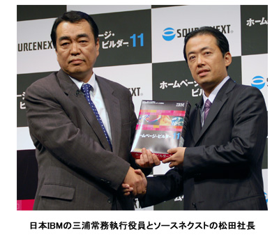開発元の日本IBM(大歳卓麻社長)ソフトウェア事業担当の三浦浩常務執行役員は「『ホームページ・ビルダー』は95年発売以降、個人ユーザーだけではなくSOHOや中堅企業、教育機関、公共機関など幅広いユーザーに愛用されている。今年の11月には累計登録ユーザー数が1000万人を突破した」とアピール。一方ソースネクストの松田社長は「全国の店頭で計1000の専用コーナーを設けたり、イベントを開催したりして出荷本数20万本を目指す」と意気込みを語った。