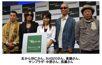 発表会見に登場した眞鍋かをりさんは、「『ホームページ・ビルダー』でホームページを作ってみたけれど、パパッと簡単に、クオリティの高いホームページを作ることができた」と使いやすさをアピール。このほか、サンプラザ・ホメオパス・中野さん、SUGIZOさん、羽仁カンタさん、信藤三雄さんが壇上に上がり、ECOをテーマにした自作のホームページを紹介した。