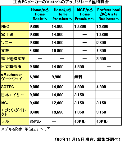 今回の優待アップグレードキャンペーンで特徴的なのは、直販メーカーやショップオリジナルブランドPCを中心に、「Windows XP Media Center Edition(MCE)」から「Windows Vista Home Premium」のアップグレード料金を「無料」「5000円以下」といった低価格に設定していること。対して、国内の主要メーカーでは、搭載OSにかかわらず、「Home Premium」へのアップグレードは、1万円前後から1万4800円と高めの設定だ。