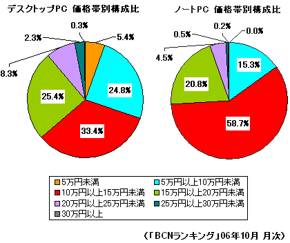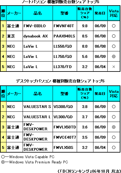 06年10月の機種別販売台数ランキングでも、デスクトップPC、ノートPCともに、上位5位以内はすべてWindows XP Home搭載モデルが占めた。さらに、上位5機種ではVistaの「Home Premium」に標準仕様のまま移行できる「Windows Vista Premium Ready PC」は、まだそれぞれ1機種がランクインするに留まっている。