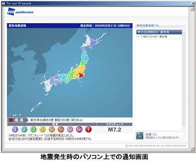 サービスはウェザーニューズのサイトから専用アプリケーションをダウンロードした後、「現在位置」「通知して欲しい震度」「マグニチュード」などを設定。地震が発生し、緊急地震速報が配信されると、インターネット経由でユーザーのパソコン上に警告音と警告画面で知らせる。通知はパソコンや携帯電話のメールにも送信可能で、地震が起きた後の各地の詳細な状況を確認することもできる。