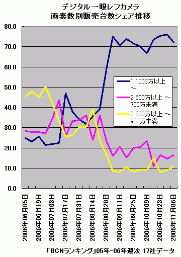 同社の610万画素デジタル一眼レフカメラ「D50」の後継機で「D50の生産は既に終了した」(広報)。「BCNランキング」でデジタル一眼レフの画素数別販売台数分布を集計したところ、11月第1週の時点で1000万画素超の製品が72.0%を超えているのが現状。これについて同社では「一眼レフの入門ユーザーにとって、重い、かさばる、高価というハードルを取り除くことを主眼に開発した。その結果610万画素のCCDを採用することになった」(同)という。また、「D50」の後継が「D40」と数字が小さくなったことについては、「特に意味はない」(同)としている。