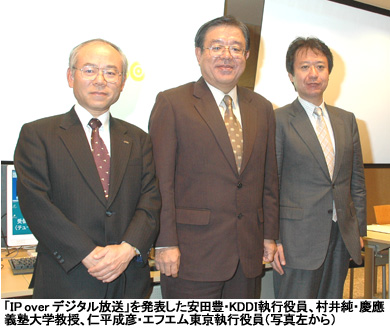 「IP over デジタル放送」は、地上デジタル放送やワンセグといったデジタルテレビ放送での利用も可能。KDDIの安田豊・執行役員技術統轄本部長は「今後はテレビ局の参画も呼びかけていきたい。また、KDDIとしては固定でだけでなく、携帯電話でも新技術を搭載し、通信と放送の融合を進めていきたい」と意気込みを述べた。