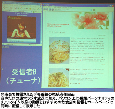 記者会見で3社は、エフエム東京が制作した試作番組を披露した。デモでは、ラジオのパーソナリティが話しているデジタル放送の音声と、その様子を撮影した動画、紹介するホームページを視聴者のパソコンにリアルタイムで同期して配信して表示したほか、視聴者がネット経由でおすすめの店のホームページアドレスをメールで番組に送り、そのサイトをパーソナリティが番組のホームページで取り上げて配信するといったやり取りが行われた。