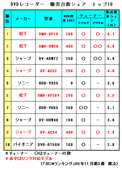 機種別でもリンク機能付きモデルの人気は高く、11月第3週のHDD-DVDレコーダー販売台数シェアのトップ10では、リンク機能搭載モデルが半数の5機種もランクインしている。なかでも10月10日に松下が発売した「VIERA Link」対応の「DMR-XP10」は、発売翌週の10月第3週(10月16日-10月22日)に初めて販売台数シェア7.5%で1位を獲得し、その後もシェアを伸ばしながら5週連続で首位の地位を守っている。11月第3週でも販売台数シェア8.1%で、1位を獲得した。
