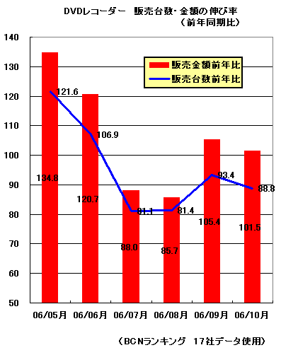 HDD-DVDレコーダー市場は、夏のボーナス商戦期に前年同月比2ケタダウンと大きく落ち込んだが、秋・冬モデルが投入された9月から上向き始め、年末に向けて盛り上がりが期待できる。特に販売台数よりも販売金額の回復が著しく、06年9月の販売金額は前年同月比105.4%、10月は同101.5%と前年実績を上回った。台数よりも金額ベースの上昇が著しいのは、高付加価値のリンク対応モデルが好調であること、HDDの大容量化が進みつつあることが要因のようだ。