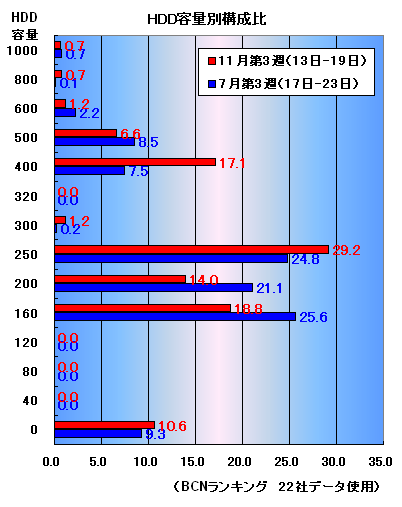 4か月前の7月第3週(7月17日-7月23日)と直近の11月第3週で、HDD容量別構成比を比較してみた。7月には160GBモデルがもっとも多く、販売台数シェアは25.6%だった。続いて200GBモデルが24.8%、200GBモデルが21.1%と160-250GBが市場の中心だった。