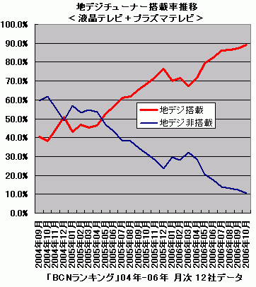 いよいよ地上デジタル放送(地デジ)が全国に広がる。12月1日に九州地区など残り8県で放送が開始され、43都道府県の全県庁所在地で地デジが視聴できるようになるからだ。エリアの拡大にしたがって対応機器も急速に増えている。特に薄型テレビの「地デジ化」は急で、10月の実売では約9割が地デジチューナー搭載モデルとなるほど。そこで、「BCNランキング」で薄型テレビ、HDD-DVDレコーダー、TVチューナー付きパソコンの「地デジ化率」を検証する。