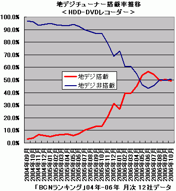 一方、HDD-DVDレコーダーの地デジ化はやや遅れている。04年の12月に販売台数で大きなピークを迎え大ブレイクしたばかり。さらに次世代DVDの趨勢がまだはっきりしない状況だ。そのうえハイビジョン番組の録画の対応など、まだ機能的に進化の余地は大きい。買い替え需要が盛り上がるのはもう少し先になりそうだ。しかし、05年10月以降のデジタル化の進展は速く、現状ではほぼ半々の状況。10月では49.4%とわずかに5割を割り込んだ。