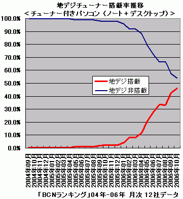 また、テレビチューナー搭載のパソコンについても、地デジ化率を集計してみた。こちらは、さらに普及が遅れているが、今年の4月のワンセグ放送開始にタイミングを合わせ、デジタル化が急激に進み始めた。しかし、ノート型、デスクトップ型いずれもTVチューナーの搭載率はこの1年で大幅に下がっており、パソコンに関しては、地デジ化に乗り遅れた感は否めない。逆に言えば、07年1月に登場するWindowsの新OS「Vista」効果による需要の盛り上がりに加え、パソコンの地デジ化が進めば、このところ不調が続くパソコン市場も活性化する可能性は高い。