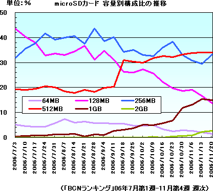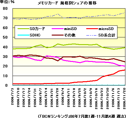 SDカードの弟分で、大きさが約4分の1と超小型の「microSDカード」。本格的に売れ出したのは、06年10月以降、ほんの1、2か月前からだ。06年7月第1週(06年7月3日-7月9日)から11月第4週(11月20日-11月26日)まで約4か月間の「BCNランキング」をもとに、メモリカード全体に占める「microSD」の構成比を見ると、急激に伸びていることがわかる。