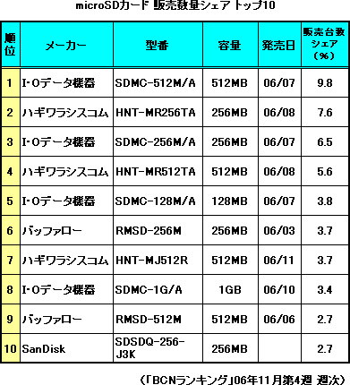 ちなみに「microSD」の構成比が一気に高まった10月第4週は、NTTドコモの「903iシリーズ」の第1弾、シャープ製端末「SH903i」の発売直後と重なる。新端末の購入と同時に、メモリカードを購入した人が少なからずいたようだ。改めて、携帯電話の影響力の高さがうかがえる。