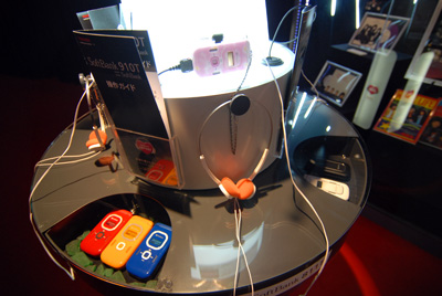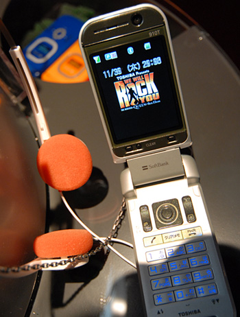 携帯電話の展示。ヘッドホンが接続してあり、音楽再生が楽しめる