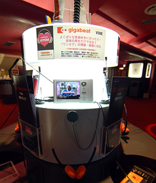 「gigabeat」のほうは、3.5型液晶の大画面でワンセグが楽しめるV30Eの各カラー(ピュアホワイト・マットブラック・クリムゾンレッド)が展示されている。携帯オーディオとしての機能はもちろん、ここでのアピールはやはりワンセグの視聴・録画。どの「gegabeat」も、ワンセグ受信状態になっている。この画面で「初めてワンセグの映像を目にした」という来場者も多いのではないかと思う。V30は液晶が大きいので、かなり本各的なテレビとして楽しめる。年末年始の帰省や旅行などでこの「gigabeat」があれば、交通渋滞や長距離の電車移動も楽しい時間になるかもしれない。