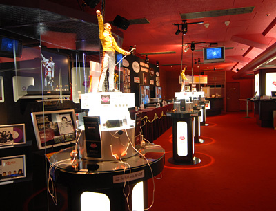 2階に上がると、ロビーには東芝の薄型テレビ「REGZA(レグザ)」やDVDレコーダー「VARDIA(ヴァルディア)」などのデジタル家電がズラリ。そして「QUEEN」の貴重な資料、写真、彼らが使ったギターなどが展示されている。