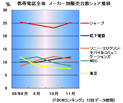 また3キャリアの販売台数を合算したメーカー別の販売台数シェアでは、シャープが前月比2.1ポイント上昇の25.2%でトップ。06年8月の調査開始以降、4か月連続の首位を独走している。ワンセグ放送の視聴に対応する「AQUOS(アクオス)ケータイ」がけん引している。