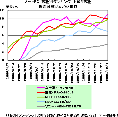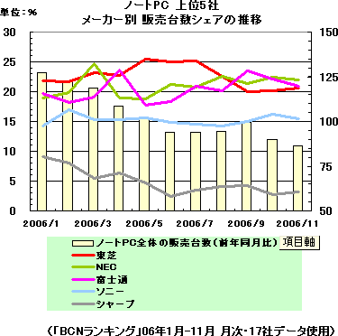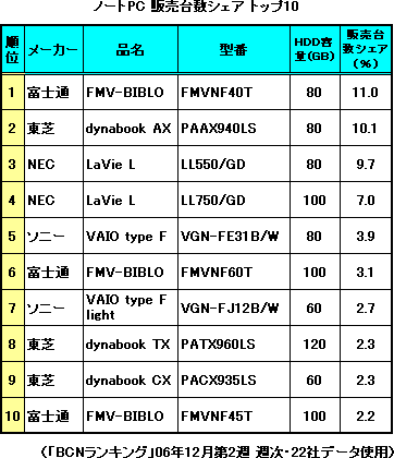 上位3機種の熾烈なトップ争いは、そのままメーカー別シェアの動向に結びつく。製品ジャンルごとに、年間トップシェアメーカーを決める「BCN AWARD」の中間集計(06年1月-11月累計)では、ノートPC部門1位はシェア23.0%で東芝、2位は21.0%でNEC、3位は20.2%で富士通となり、機種別ランキング同様、富士通・東芝・NECの3社がわずかな差で競っている。