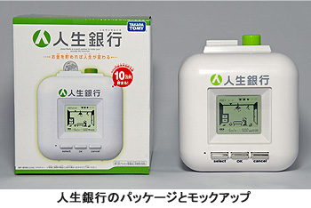 タカラトミー(富山幹太郎社長)は、最大10万円まで貯めることができる500円硬貨専用の液晶表示つき貯金箱「人生銀行」を12月28日に発売すると発表した。価格はオープンで、実勢価格は4987円前後の見込み。本体は白をベースにしたキューブ型。前面に32×48ドットの液晶パネルをつけ、1万円から10万円まで、500円単位の目標貯金額、貯金完了日などが設定できる。液晶パネルには現在までの貯金額、貯金完了日までの残りの日数、目標までの金額などのほか、日付や現在時刻を表示することができる。電源は単3電池3本。