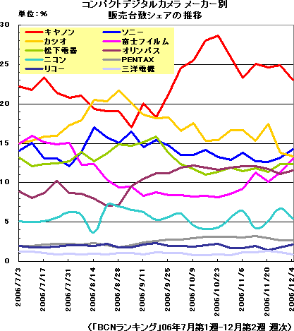 また同じ頃、9月第2週にキヤノンに肉薄し、シェア第2位に迫ったのがソニーだ。カードサイズの薄型ボディに手ブレ補正機能と高感度撮影機能を搭載したことで一躍人気となった「Cyber-shot T9」。その後継機「Cyber-shot T10」が登場したのだ。新製品と処分価格で販売された旧製品の両方が一気に売れた相乗効果がソニーのシェアを押し上げたかたちとなった。12月第2週では、夏以降じりじりとシェアを落とすカシオを抜き、キヤノンに次ぐ2位のポジションにジャンプアップした。