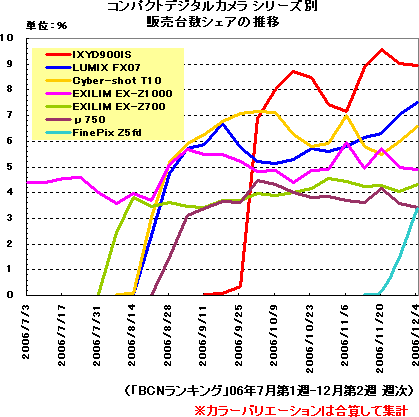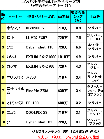 直近の機種別販売台数シェアを見る前に、まず、06年夏以降のコンパクトデジカメ市場の動向をおさらいしておこう。7月第2週(3-9日)から12月第2週(4-10日)にかけて、「BCNランキング」のメーカー別販売台数シェアで最も存在感が大きかったメーカーは、やはりキヤノンだ。とくに10月以降は、他社をまったく寄せ付けない強さで、シェアトップを独走している。このキヤノンの好調を牽引してきたのが、7月は「IXY DIGITAL 800IS」で、10月以降はその後継機である「IXY DIGITAL 900IS」だ。また、「IXY DIGITAL 70」も堅調なシェアを維持しており、キヤノン人気を支えてきた。