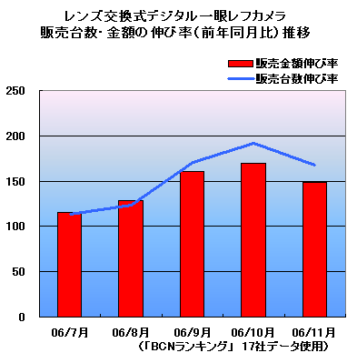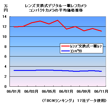 一方、デジタル一眼とコンパクトデジカメの平均価格推移をみると、コンパクトデジカメが3万円台前半で安定しているのに対し、デジタル一眼レフカメラは徐々に価格を下げ、06年11月では1月よりも1万円ほど安く11万円前後になっている。